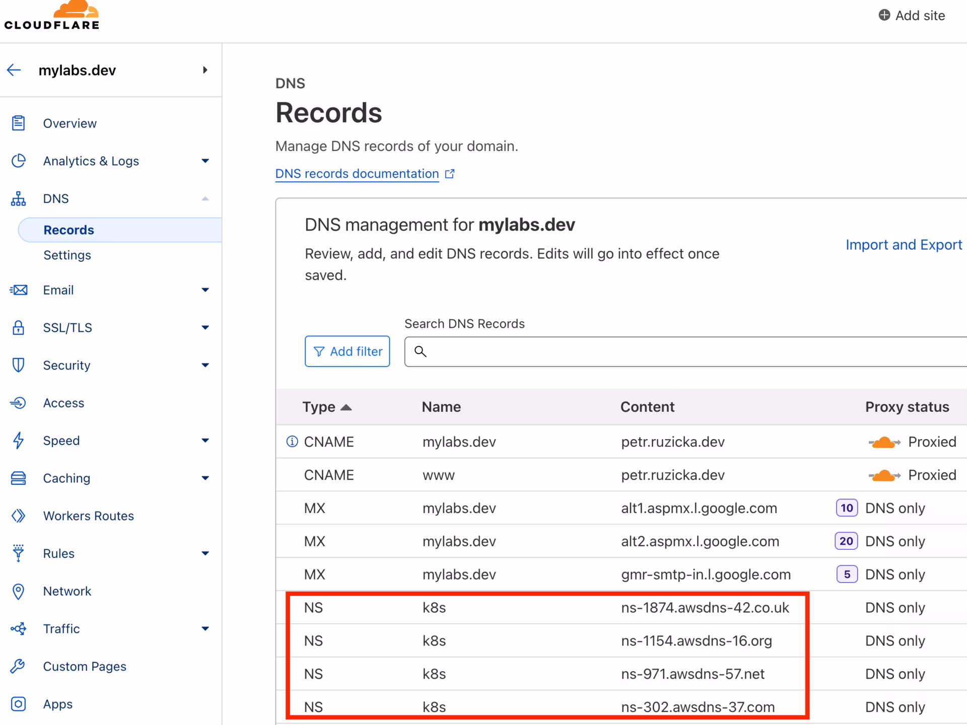 Establish the NS record in k8s.mylabs.dev (your BASE_DOMAIN) for proper zone delegation. This operation’s specifics may vary based on your domain registrar; I use Cloudflare and employ Ansible for automation: