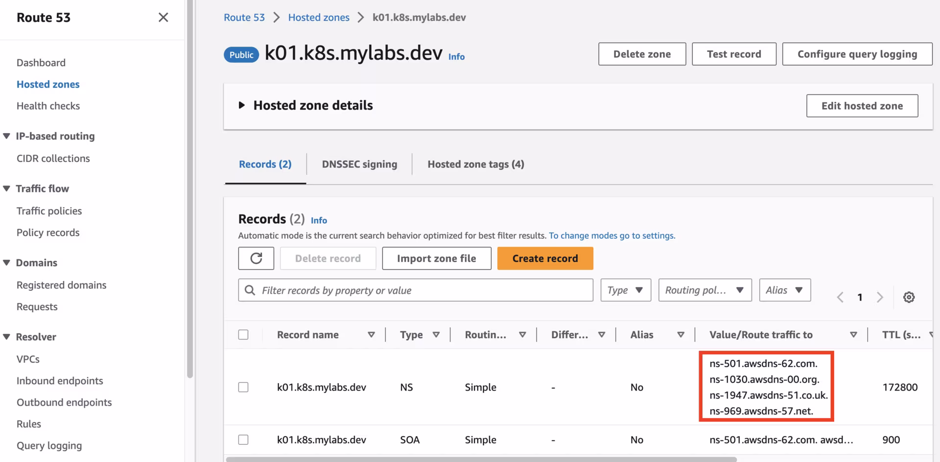 Utilize your domain registrar to update the nameservers for your zone (e.g., mylabs.dev) to point to Amazon Route 53 nameservers. Here’s how to discover the required Route 53 nameservers: